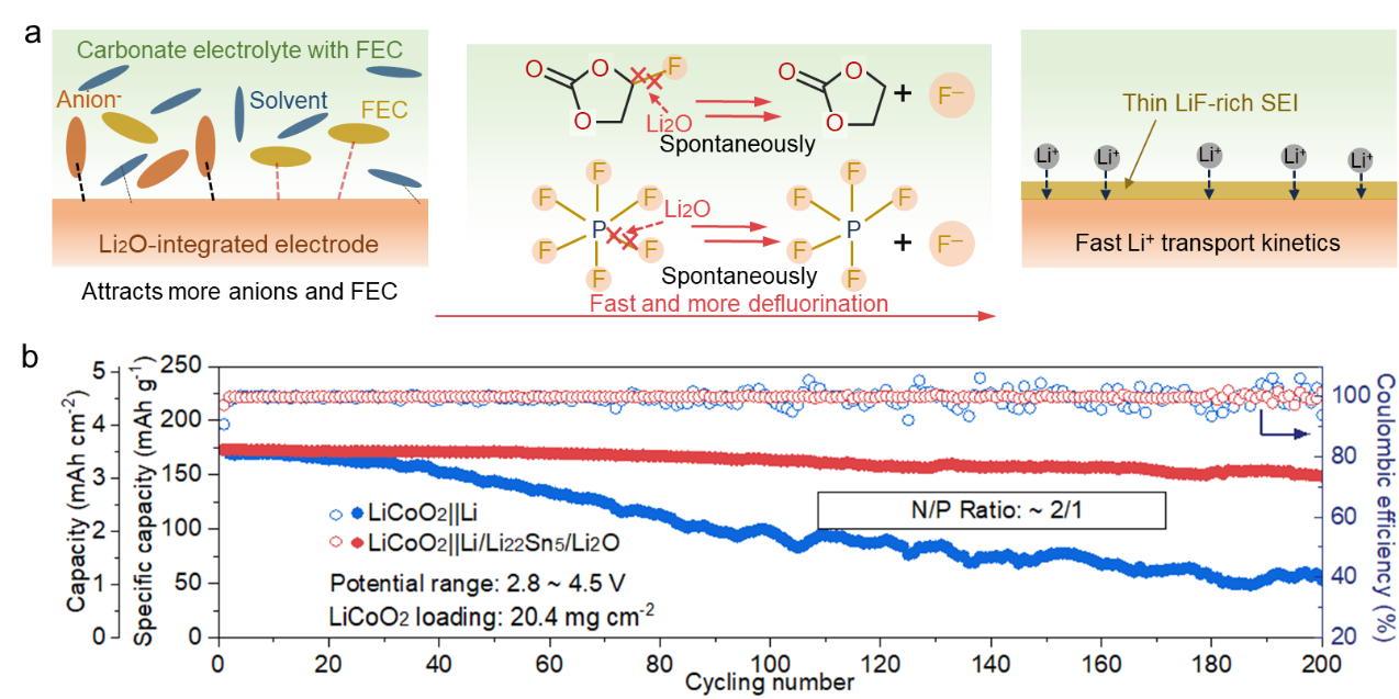 10月8日,长江大学成人网 肖围教授课题组在高性能锂金属电池领域取得重要研究进展,其成果"Li2O-Integrated Electrodes Enabling Enhanced Adsorption/Defluorination Kinetics toward LiF-Rich Interphase for High-Performance Lithium Metal Batteries"发表于国际顶级学术期刊Advanced Functional Materials。该研究创新性地通过电极设计,集成对碳酸酯电解液中含氟组分吸附/去氟化能力强的纳米氧化物,在金属锂电极表面原位构筑了化学/电化学稳定的含氟保护层,改善了锂金属负极的电化学性能。李国成博士为论文第一作者,肖围教授为论文第一通讯作者,长江大学为论文通讯第一单位。 内容简述: 锂金属负极因其极低的氧化还原电位和极高的理论比容量,被视为下一代高能量密度电池的理想选择。然而,其实际应用受限于较差的循环稳定性,主要归因于与碳酸酯电解液的高反应性。这种反应导致形成不稳定的固体电解质界面(SEI),在循环过程中易破裂,持续消耗活性锂和电解液。同时,天然SEI在组成、形貌和离子导率上的不均匀性会引发锂离子通量分布不均和成核位点杂乱,进而导致枝晶生长和电池短路。构建稳定均一的SEI层成为抑制副反应和枝晶问题的关键。研究发现,富含LiF等无机成分的SEI可有效提升界面稳定性。现有策略(如高浓度电解液、添加剂和表面修饰)主要通过调控电解液组成或界面化学来促进含氟物种分解生成LiF,但往往依赖复杂配方或精密工艺。相比之下,从电极设计入手,开发能高效吸附并促进含氟组分去氟化的新方法,为构建稳定富LiF界面提供了更具潜力的替代路径。 本研究提出了一种通过调控复合电极对含氟电解质组分的吸附与去氟化动力学,以定向构筑富LiF界面的新策略。采用机械化学方法,在Li/Li22Sn5复合电极中实现了Li2O纳米颗粒的原位、均匀嵌入。研究表明,Li2O对PF6⁻和氟代碳酸亚乙酯(FEC)具有强吸附能力,可加速其自发去氟化过程,进而引导形成以阴离子/FEC衍生物为主的富LiF 固体电解质界面。结合光谱学表征与理论计算,证实了Li22Sn5表面对含氟物种具有优先吸附与去氟化促进作用具有优先吸附与去氟化促进作用,揭示了该界面结构的形成机制。同时,稳定的Li22Sn5合金骨架有助于引导均匀锂沉积并缓冲体积变化,与Li2O协同增强电极稳定性。该复合负极在碳酸酯电解液中实现50次循环内平均库仑效率99.0%。与LiCoO2正极组装的完整电池在苛刻条件(N/P = 2:1,贫电解液20 μL)下表现出优异的循环稳定性,面容量为3.3 mAh cm⁻2,200周后容量保持率达87.0%;180 mAh软包电池在100次循环后仍保持78.2%的容量,充分证明了该电极设计策略的实际应用潜力。 该研究工作得到了国家自然科学基金(52272207和52274292)、北京自然科学基金(2192029)、湖北省杰出青年基金(2020CFA090)等项目的支持。 图文摘要: 图(a)Li/Li22Sn5/Li2O电极吸附/去氟化构筑富含LiF固态电解质界面层示意图;(b)LiCoO2||Li/Li22Sn5/Li2O、LiCoO2||Li电池循环性能对比图。 文章链接://advanced.onlinelibrary.wiley.com/doi/epdf/10.1002/adfm.202523194 (审核:肖围 编辑:常艳玲)